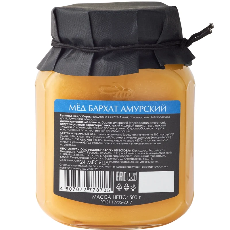 Этот мёд собирается в ограниченный период времени на ограниченной территории, попробовать его - настоящая удача и редкое удовольствие. Бархат Амурский - это реликтовое дерево, которое растёт в ограниченном ареале. Растение цветёт в течение всего 10 дней в конце июня – начале июля. При этом оно очень чувствительно к погодным условиям и цветёт только в хорошую погоду. Вкусовые свойства: мёд обладает нежным сладким вкусом, с продолжительным фруктовым оттенком. Мёд имеет пряный насыщенный медовый аромат. Мёд обладает нежной шелковистой консистенцией, напоминающей мягкое сливочное масло. Цвет светло-янтарный с белым оттенком. Целебные свойства мёда с Бархата Амурского обусловлены большим количеством фитонцидов, дубильных веществ, алкалоидов и витаминов. Пчелиный нектар получает все компоненты, содержащиеся в лечебном дереве. При регулярном употреблении мёда нормализуется режим сна, он предотвращает развитие депрессий и нервных расстройств. Поэтому он полезен в период простуд, во время физической и моральной перегрузки.