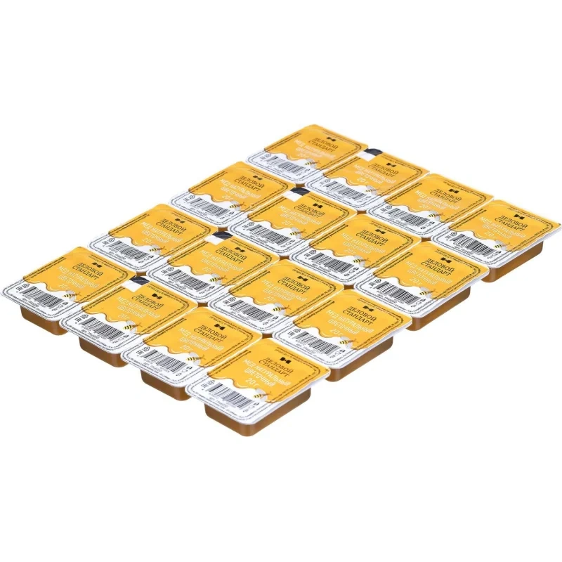 Мед цветочный порционный Деловой Стандарт 20 г (16 штук в упаковке). Мед является удивительным продуктом по наличию полезных свойств. Мед оказывает противовирусное, антиоксидантное и противомикробное действие, снижение риска сердечно-сосудистых заболеваний, оказание положительного действия на нервную систему, активация иммунитета, укрепление костной ткани. Удобная порционная упаковка прекрасно подойдет для офисных кофе-зон, переговорных комнат современных компаний, а также станет полезным угощением для гостей и клиентов в шоу-рум и на ресепшен. Это интересный бизнес-сувенир для различных выставок и презентаций. Состав: мед натуральный цветочный. Пищевая ценность в 100 г : белки - 0.8 г, углеводы ?74.8 г. Энергетическая ценность на 100 г продукта: 310 ккал/1270 кДж. ГОСТ 19792-2017. Срок и условия хранения: 24 месяца при температуре не выше 20С, вдали от прямых солнечных лучей. После вскрытия хранить не более 12 месяцев.