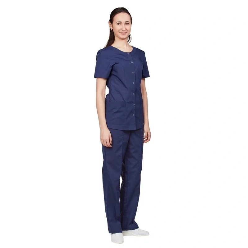 Медицинская блуза женская м16-БЛ полуприлегающего силуэта изготовлена из смесовой ткани Ти-Си (35% хлопок, 65% полиэстер) плотностью 120 г/кв. м с водоотталкивающей пропиткой. Цвет синий. Блуза с центральной застежкой на семь рубашечных металлических кнопок, с притачными планками по краю борта. На полочке вертикальные рельефы, выходящие из проймы. Полочки с двумя накладными карманами, входящими в рельефы и боковые швы. Верхний срез кармана обработан обтачкой. На боковых частях полочек на уровне линии талии настрочены планки, входящие в рельефы и боковые швы. Вырез горловины круглый, обработан обтачкой на лицо. Спинка цельнокроеная. На спинке на уровне линии талии два полупояса, выходящие из боковых швов. Рукава одношовные, короткие. Низ рукава обработан вподгибку с открытым срезом. Вместе с брюками составит медицинский костюм. Медицинская одежда стирается в обычном режиме, не превышая температуру 40 градусов Цельсия. Запрещено отбеливать, разрешена химчистка в обычном режиме. Сушить в подвешенном состоянии не отжимая, утюжить при температуре не выше 150 градусов. Блуза относится к спецодежде для защиты от общих производственных загрязнений. Рекомендована для использования в сфере красоты и здоровья: медицинские центры, салоны красоты. Размер 60-62, рассчитана на рост 158-164. Длина по спинке (измеряется от шва втачивания воротника до низа) 66 +/- 1 см; Длина по полочке (измеряется от высшей точки горловины до низа) 69,9 +/- 1 см; Ширина по груди (измеряется в застегнутом виде на уровне проймы) 69,2 +/- 1 см; Ширина по талии (измеряется в застегнутом виде на уровне пояса) 67,3 +/- 1 см; Ширина спинки (измеряется в самом узком месте) 57 +/- 1 см; Ширина по низу (измеряется в застегнутом виде) 73,5 +/- 1см; Длина рукава (измеряется от плеча до манжеты) 23,4 +/- 1 см; Ширина рукава (измеряется под проймой в двое сложенном виде) 26 +/- 0,5 см; Ширина рукава по низу (измеряется по манжете, в двое сложенном виде) 23,7 +/- 0,5 см; Ширина плеча 16,2 +/- 0,5 см.