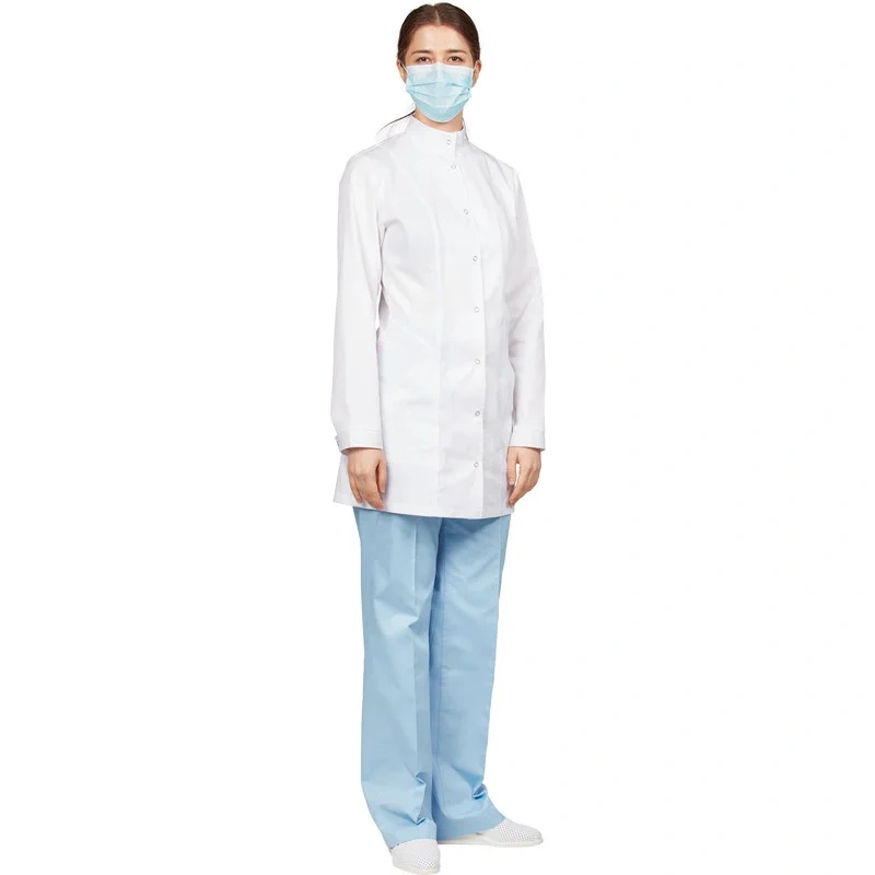 Брюки женские М-14-БР прямые изготовлены из ткани Санторини ( 55% хлопок 45% полиэстер) плотностью 150 г/кв. м с водоотталкивающей пропиткой. Цвет голубой, размер 60-62, рассчитаны на рост 170-176. Пояс притачной на резинке. Брюки с застроченными стрелками на передних половинках. На правой передней половинке брюк расположен накладной карман, который одной стороной входит в боковой шов. Стирку брюк необходимо производить в обычном режиме, не превышая температуру 40 градусов Цельсия. Запрещено отбеливать, разрешена химчистка в обычном режиме. Сушить в подвешенном состоянии не отжимая, утюжить при температуре не выше 150 градусов. Брюки относятся к спецодежде для защиты от общих производственных загрязнений.