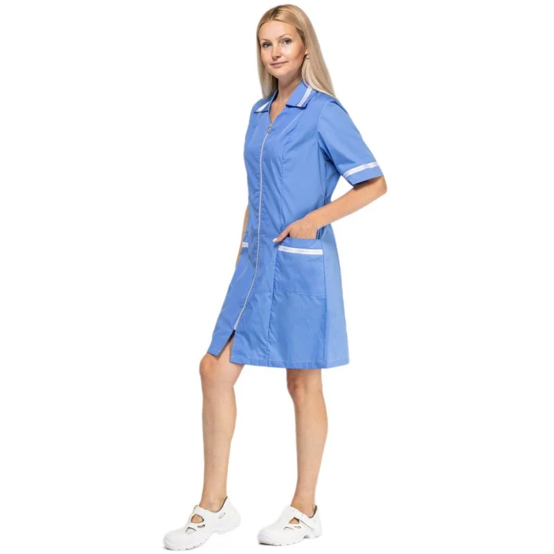 Силуэт халата приталенный, с рельефными швами на полочке и спинке. По фигуре он регулируется с помощью пояса на пуговицах. Манжеты коротких рукавов, карманы и отложной воротник украшены декоративной лентой. Халат оснащён двумя накладными карманами, втачиваемыми в боковой и рельефный шов, и застёжкой на молнию. Эластичные вставки отсутствуют.