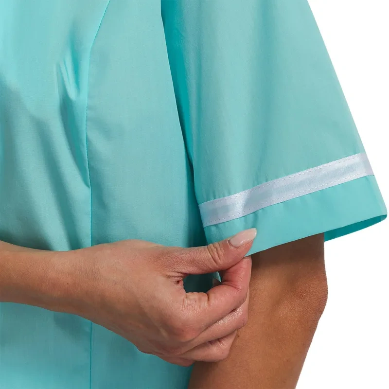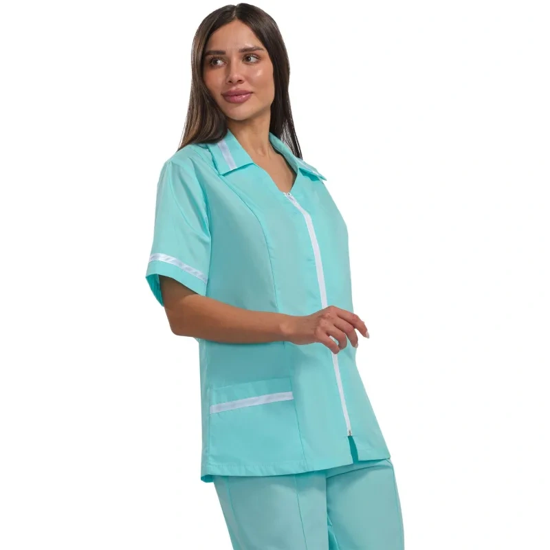 Коллекция м09 представлена: костюмами куртка с коротким рукавом и брюками м09-КБР, а также халатами с коротким рукавом м09-ХЛ в цветах: серо-голубой, морской волны, розовый.