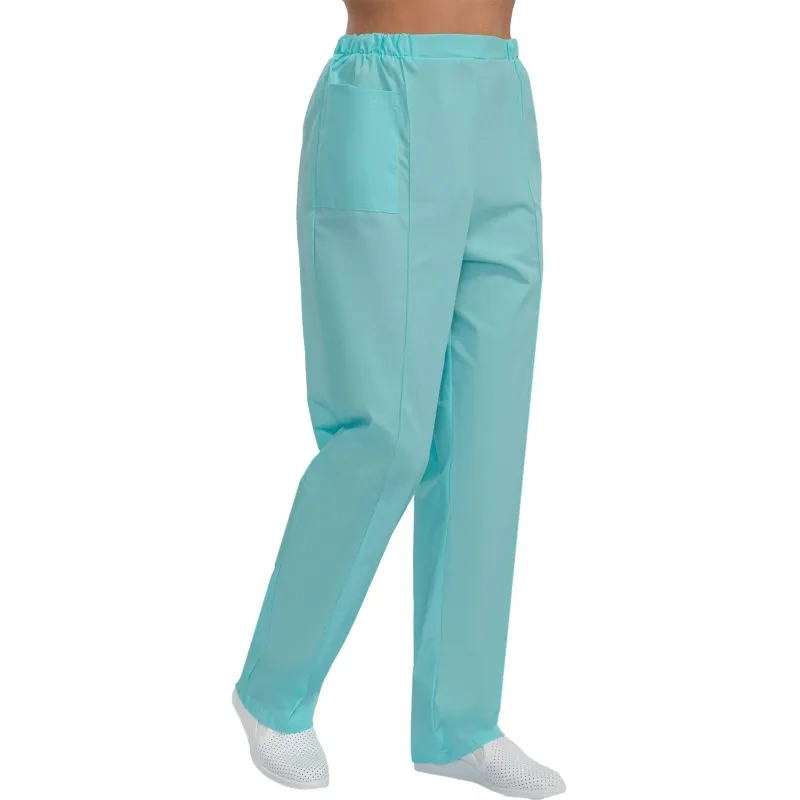 Брюки прямые, с застроченной стрелкой спереди, боковым накладным карманом в боковом шве, на эластичной резинке.