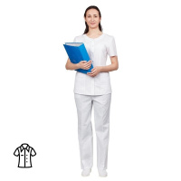 Медицинская блуза женская м16-БЛ полуприлегающего силуэта изготовлена из смесовой ткани Ти-Си (35% хлопок, 65% полиэстер) плотностью 120 г/кв. м с водоотталкивающей пропиткой. Цвет белый. Блуза с центральной застежкой на семь рубашечных металлических кнопок, с притачными планками по краю борта. На полочке вертикальные рельефы, выходящие из проймы. Полочки с двумя накладными карманами, входящими в рельефы и боковые швы. Верхний срез кармана обработан обтачкой. На боковых частях полочек на уровне линии талии настрочены планки, входящие в рельефы и боковые швы. Вырез горловины круглый, обработан обтачкой на лицо. Спинка цельнокроеная. На спинке на уровне линии талии два полупояса, выходящие из боковых швов. Рукава одношовные, короткие. Низ рукава обработан вподгибку с открытым срезом. Вместе с брюками составит медицинский костюм. Медицинская одежда стирается в обычном режиме, не превышая температуру 40 градусов Цельсия. Разрешена химчистка в обычном режиме. Сушить в подвешенном состоянии не отжимая, утюжить при температуре не выше 150 градусов. Блуза относится к спецодежде для защиты от общих производственных загрязнений. Рекомендована для использования в сфере красоты и здоровья: медицинские центры, салоны красоты. Размер 48-50, рассчитана на рост 170-176. Длина по спинке (измеряется от шва втачивания воротника до низа) 68,5 +/- 1 см; Длина по полочке (измеряется от высшей точки горловины до низа) 71,7 +/- 1 см; Ширина по груди (измеряется в застегнутом виде на уровне проймы) 54,2 +/- 1 см; Ширина по талии (измеряется в застегнутом виде на уровне пояса) 52,1 +/- 1 см; Ширина спинки (измеряется в самом узком месте) 44,7 +/- 1 см; Ширина по низу (измеряется в застегнутом виде) 58,5 +/- 1см; Длина рукава (измеряется от плеча до манжеты) 22,6 +/- 1 см; Ширина рукава (измеряется под проймой в двое сложенном виде) 21,8 +/- 0,5 см; Ширина рукава по низу (измеряется по манжете, в двое сложенном виде) 19,4 +/- 0,5 см; Ширина плеча 13,2 +/- 0,5 см.