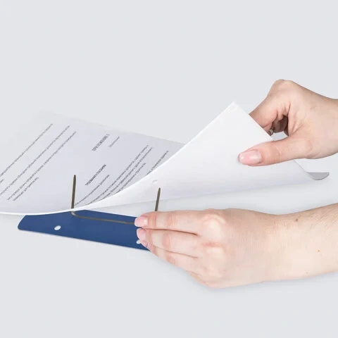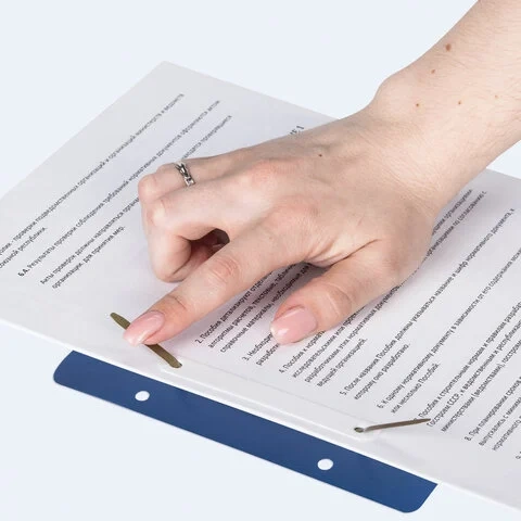 В комплект входит 50 штук. Механизм размером 160х36 мм состоит из металлопластика синего цвета. Длина ножек - 35 мм, а расстояние между отверстиями составляет 80 мм. Вмещает до 100 листов.