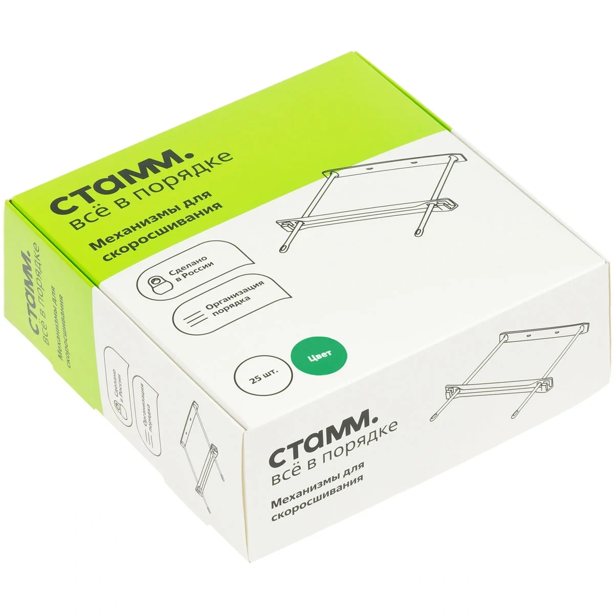 Механизмы для скоросшивания «СТАММ» предназначены для архивирования перфорированной документации. Одно изделие рассчитано на сшивание до 600 листов. На механизмах предусмотрен фиксатор, который позволяет надёжно закрепить документы. Длина ножек изделия составляет 10 см. В наборе 25 штук механизмов. Упаковка – картонная коробка, дополненная изображением пошаговой инструкции по применению изделий. Цвет механизмов – зелёный. Изготовлены из качественного полипропилена.