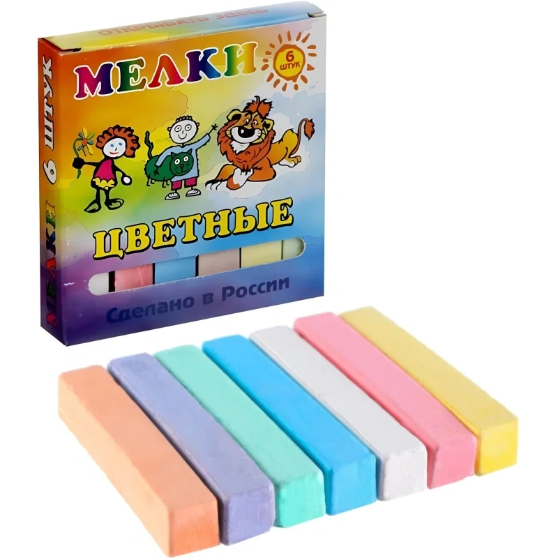 Мел школьный цветной Пегас (6 штук в упаковке) Цветной мел предназначен для письма и рисования на различных поверхностях, включая школьные доски и асфальт. Благодаря ярким и насыщенным оттенкам, он идеально подходит для учебных занятий, творческих работ и игр на свежем воздухе. Изготовлен из экологически чистых материалов, не содержит примесей и добавок, что делает его безопасным для использования. Мел не крошится, не оставляет царапин, обеспечивая плавное и аккуратное нанесение цвета. Мел имеет среднюю твёрдость и квадратную форму, что предотвращает скатывание и делает процесс рисования и письма более комфортным. В набор входит 6 цветов: белый, голубой, оранжевый, зелёный, жёлтый, розовый. Мел упакован в картонную коробку, удобную для хранения и транспортировки. Длина каждого мелка - 80 мм, ширина - 13 мм.