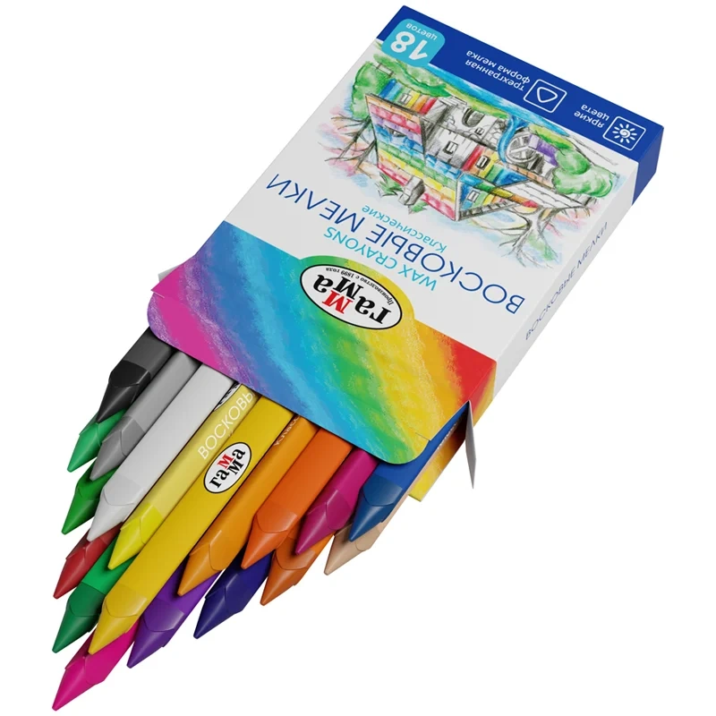 Набор из 18 восковых мелков ГАММА серии «Классическая» отлично подойдёт для рисования на бумаге, картоне и любой шероховатой поверхности. Мелки имеют эргономичную трёхгранную форму, длина мелка составляет 90 мм, а диаметр корпуса — 8 мм. В наборе 18 ярких цветов. Они идеальны для первых начинаний ребенка в рисовании и раскрашивании, так как они удобно лежат в руке. Мелки производятся на основе натуральных растительных компонентов: воска и естественных пищевых красителей. Мелки не пачкают руки, не липнут, не имеют выраженного химического запаха. Каждый мелок обёрнут в бумажную гильзу и уже заточен.