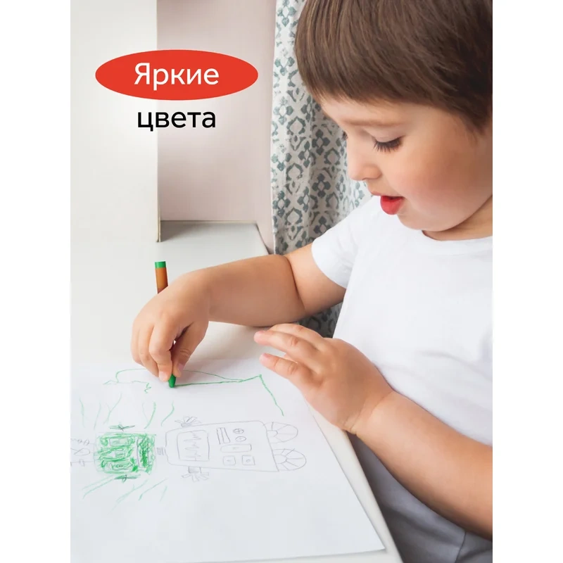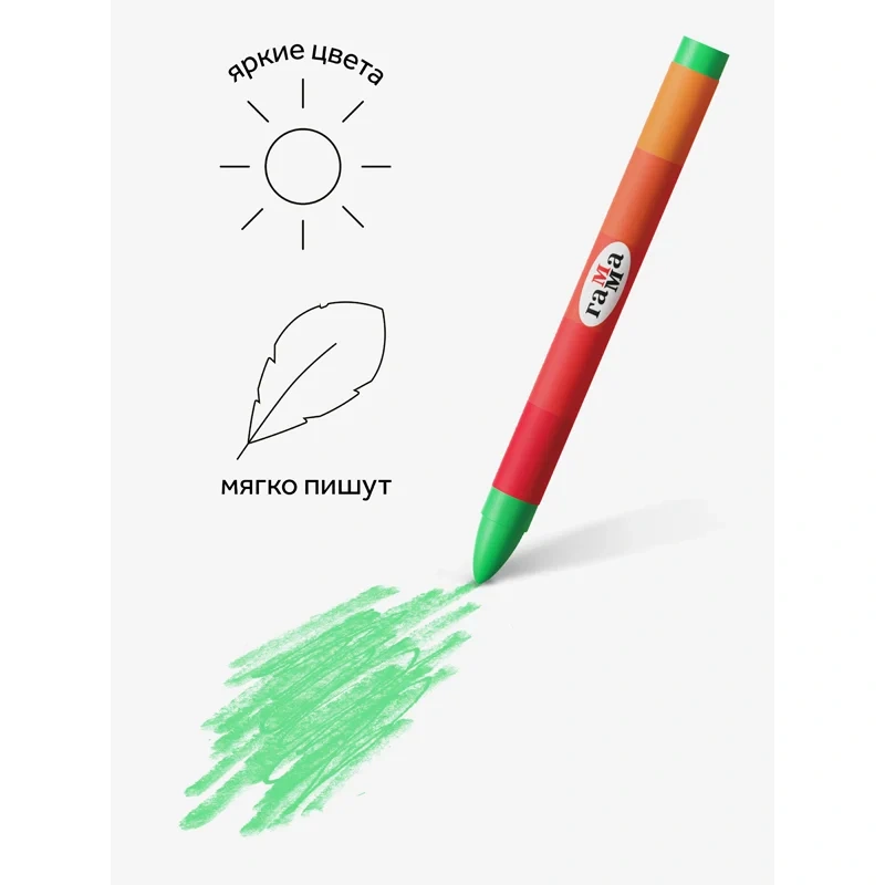 Набор из 24 цветных восковых мелков ГАММА серии «Мультики» отлично подойдёт для рисования на бумаге, картоне и любой шероховатой поверхности. Мелки имеют круглую форму, длина мелка составляет 90 мм, а диаметр корпуса — 8 мм. В наборе 24 ярких цвета. Мелки идеальны для первых начинаний ребенка в рисовании и раскрашивании, так как они удобно лежат в руке и не требуют сильного нажатия. Они производятся на основе натуральных растительных компонентов: воска и пигментов. Мелки не липнут к рукам и не пачкают их, не имеют выраженного химического запаха. Каждый мелок обёрнут в бумажную гильзу и уже заточен.