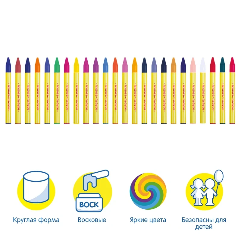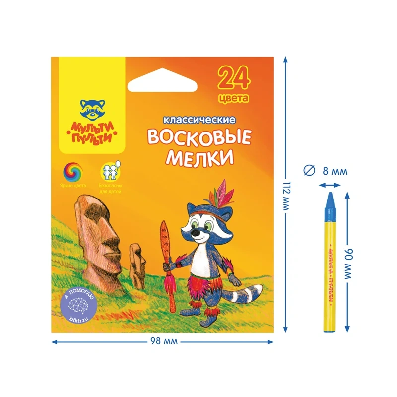 Набор из 12 восковых мелков «Мульти-Пульти» серии «Енот на острове Пасхи» отлично подходит для рисования и воплощения смелых творческих идей. В наборе 24 ярких цвета. Мелки имеют круглую форму, длина мелка составляет 90 мм, а диаметр корпуса — 8 мм. Они легко наносятся на бумагу, картон, дерево, керамику. Особых условий хранения и транспортировки не требуют. Подходят для детей старше 3-х лет. Каждый мелок представлен в бумажной обёртке.