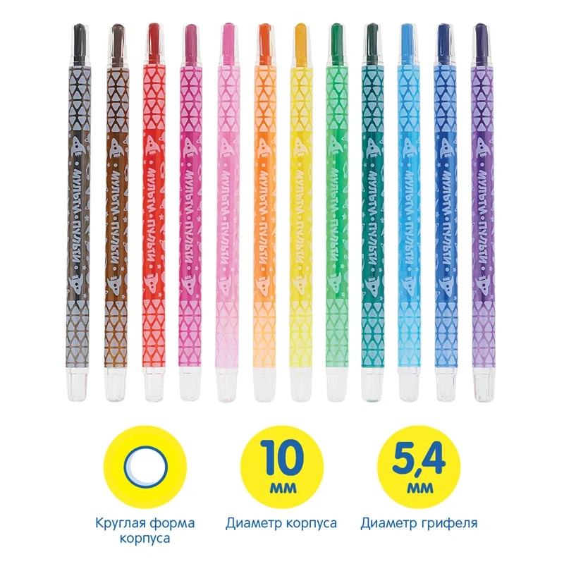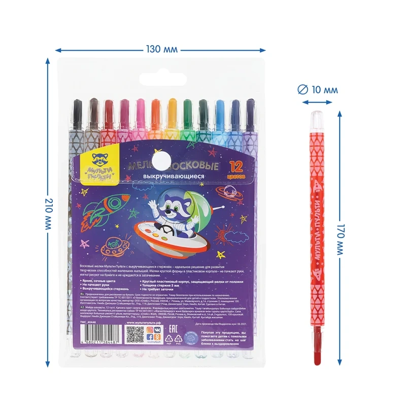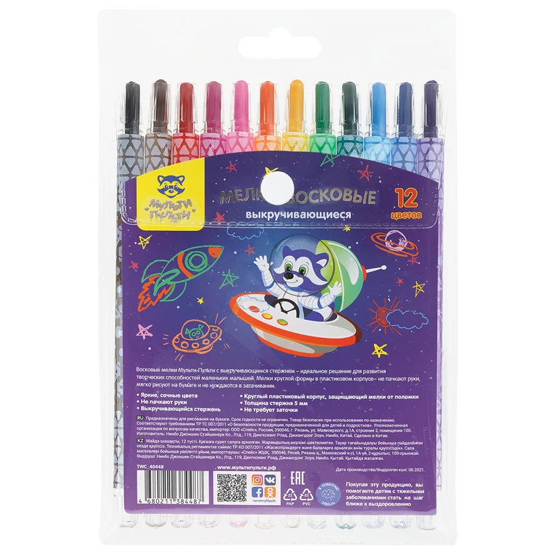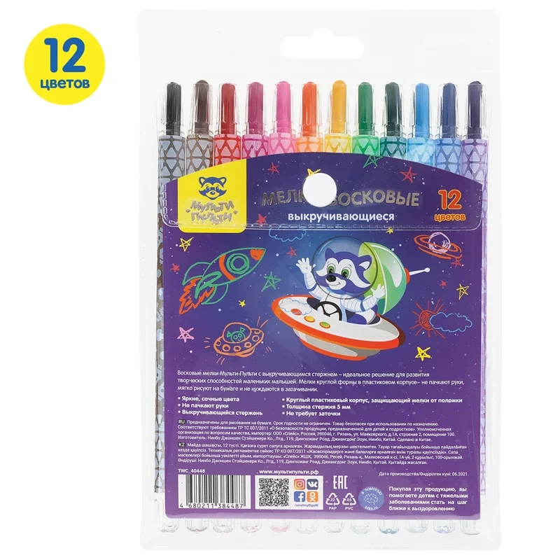 Мелки восковые выкручивающиеся Мульти-Пульти, 'Енот в космосе', 12цв., круглые, ПВХ чехол, европодве