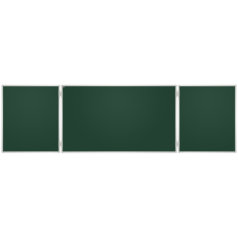 Трехсекционная магнитно-меловая доска предназначена для применения в учебных заведениях. Зелёное лаковое покрытие предназначено для письма мелом. Металлическая поверхность позволяет размещать материал с информацией при помощи магнитов.
