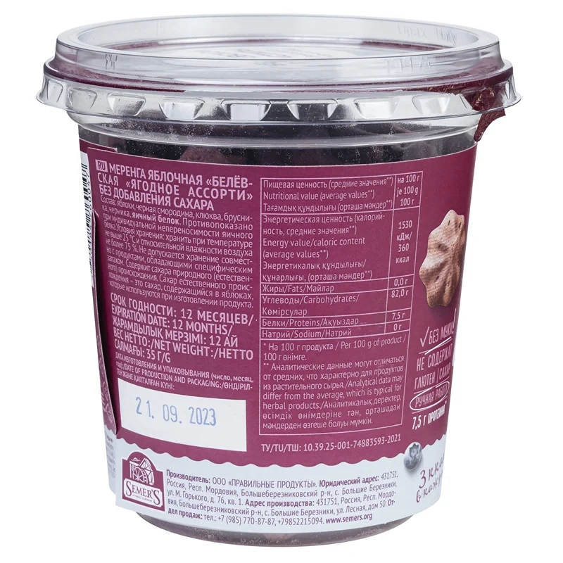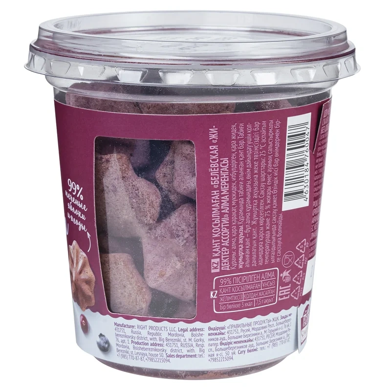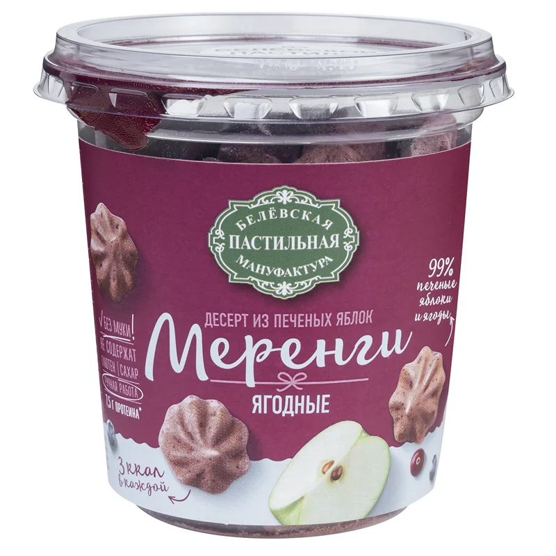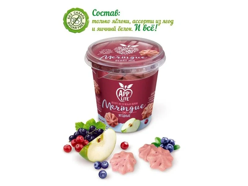 Ароматное хрустящее безе из натурального яблока, черной смородины, клюквы, брусники и черники. Диетический продукт, не содержащий сахара, великолепно дополнит ежедневный рацион поклонников здорового питания. Яблочная меренга в удобной упаковке позволит быстро и вкусно перекусить в течение дня. Безе не содержит сахар, поэтому отлично подойдёт в качестве лёгкого перекуса не только взрослым, но и маленьким детям. Как известно, натуральные яблоки высоко ценятся за свою пользу врачами и диетологами во всем мире. В яблоках содержатся витамины A, С, В1, В2 и Е, а также магний, фосфор, йод, железо, селен, калий, кальций и цинк. В совокупности эти элементы придают сил, помогают справляться со стрессом, улучшают работоспособность мозга и укрепляют сердечно-сосудистую систему.