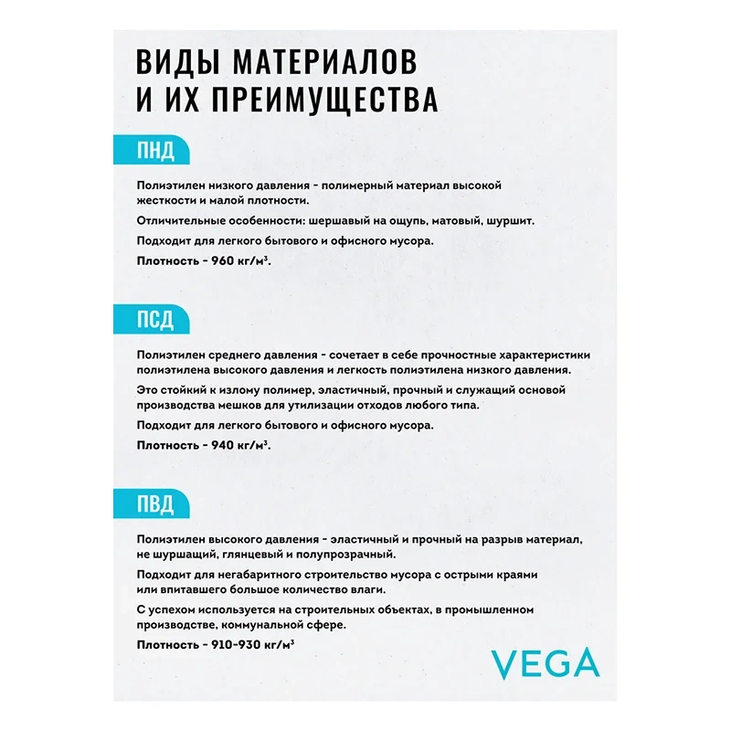 Мешки для мусора VEGA производятся из полиэтилена высокого давления (ПВД). Мешки объемом 160 литров размера 80*106 см плотностью 20 мкм используются для хозяйственных, промышленных нужд. В рулоне 10 штук.
