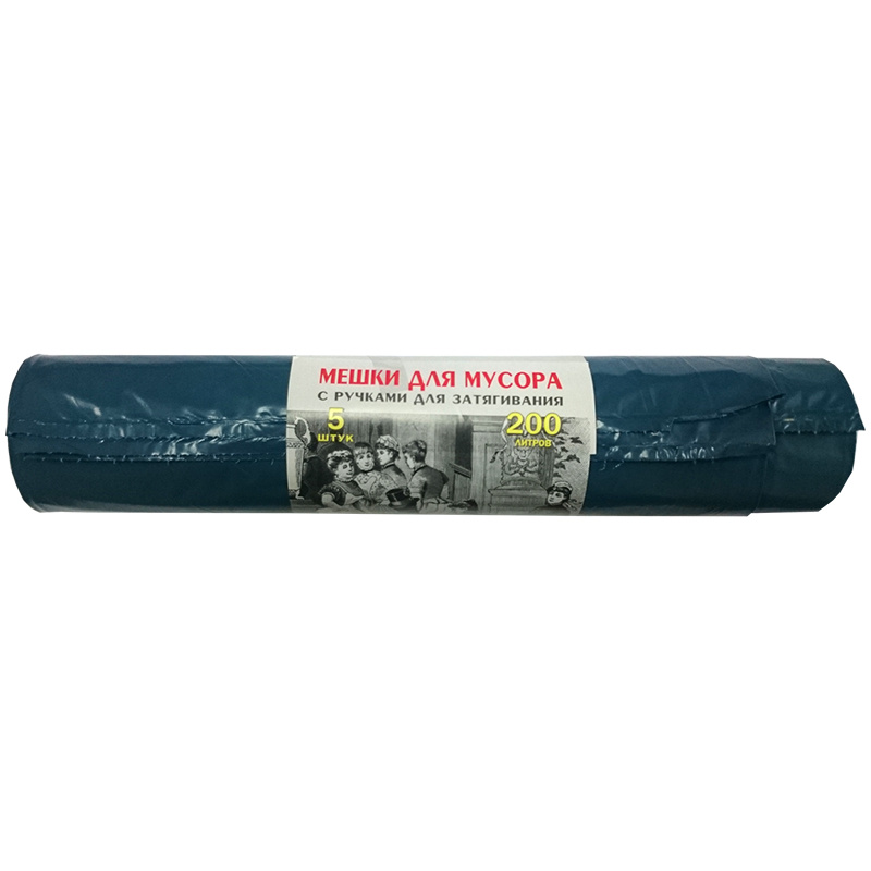 Пакеты для мусора синего цвета из полиэтилена высокого давления с тесьмой, позволяющей стянуть и завязать верхний край пакета. Для объемного мусора.