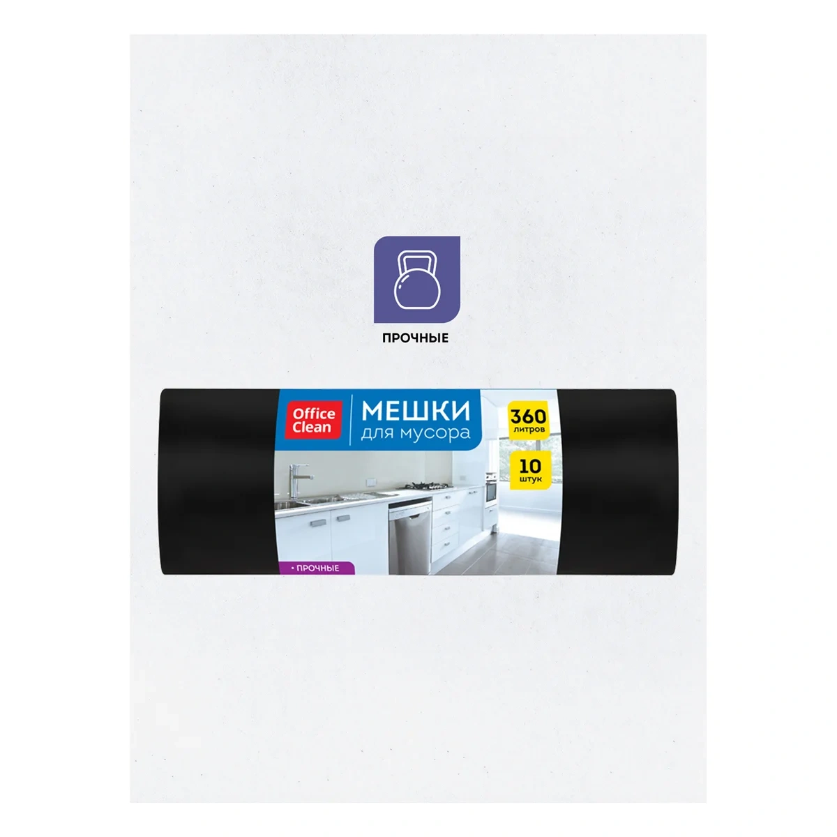 Мешки для мусора 360л OfficeClean ПВД, 110*140см, 60мкм, 10шт., прочные, черного цвета, в рулоне