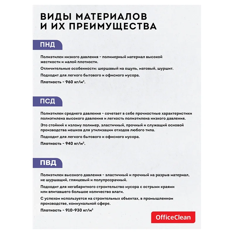 ПСД сочетает в себе прочностные характеристики полиэтилена высокого давления и легкость полиэтилена низкого давления. Это стойкий к излому полимер, эластичный, прочный и служащий основой производства мешков для утилизации отходов любого типа.
