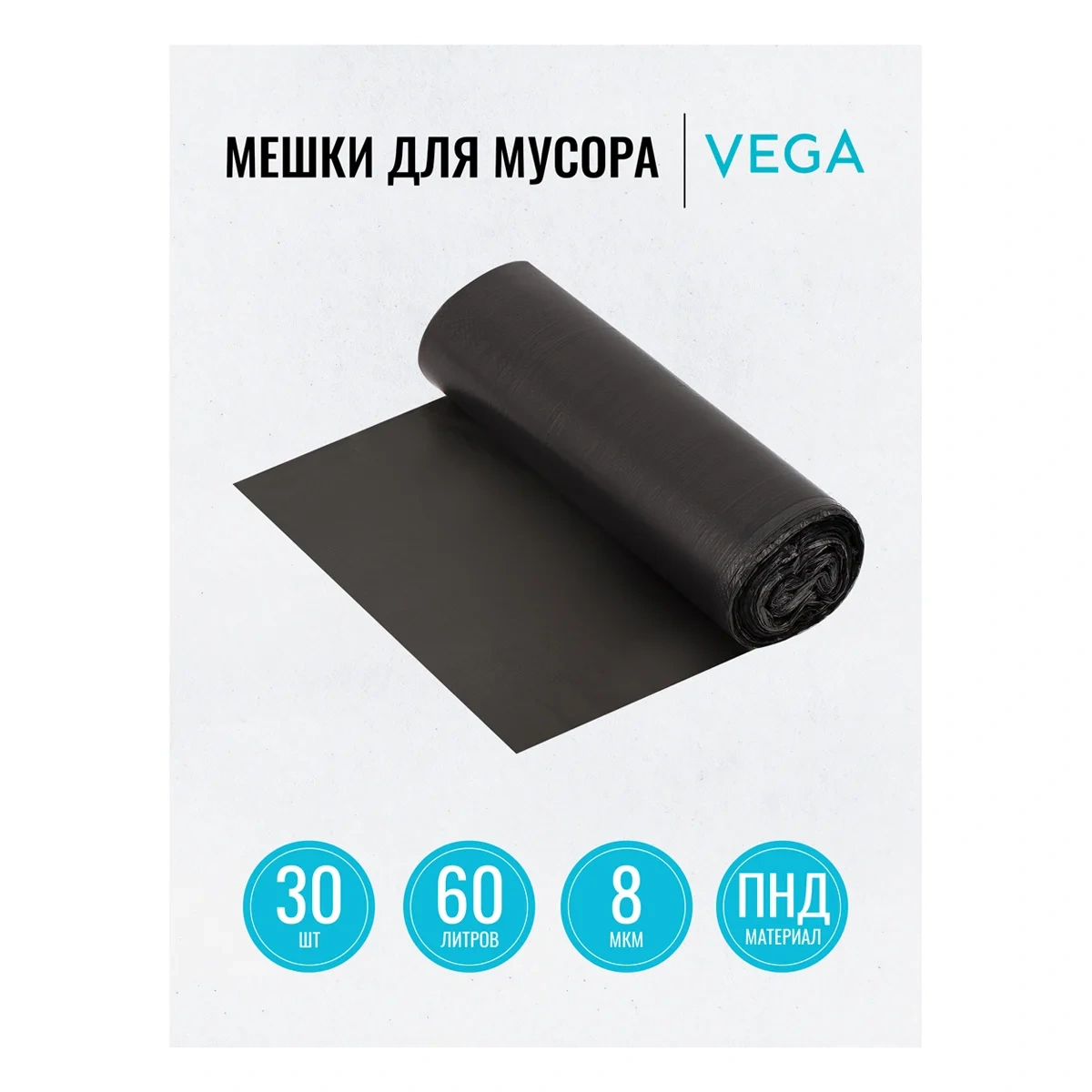 Мешки для мусора 60л Vega ПНД, 60*70см, 8мкм, 30шт., черного цвета, в рулоне