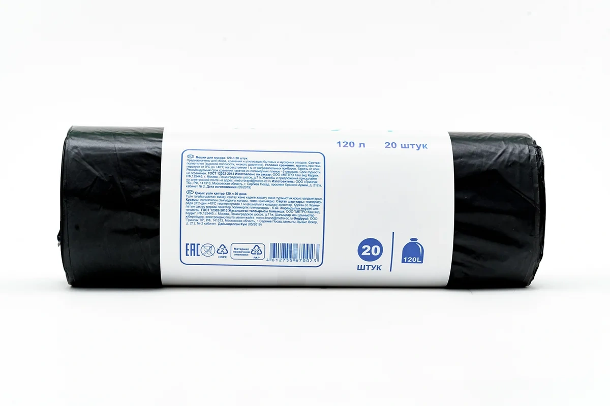 aro Мешки для мусора без тесемок 120л, 20шт — прочные и надежные, они используются в самых разных сферах. Их можно применять в домашних условиях и на самых разных предприятиях. Ими застилают уличные урны соответствующего размера. Одноразовые мусорные пакеты удобны в эксплуатации. В них можно складывать бытовой мусор и пищевые отходы. Они способны выдерживать значительный вес. Устойчивы к механическому воздействию и другим внешним факторам. Мешки для мусора поставляются в рулонах. Они занимают мало места. В каждом рулоне находятся пакеты, отделенные друг от друга с помощью перфорации. Достаточно небольшого усилия, чтобы отделить один или несколько пакетов от рулона. При этом кромки не повреждаются. Изготавливают изделие из прочного полиэтилена черного цвета. Этот материал полностью безопасен для человека. При контакте с пищевыми продуктами не выделяет вредных и токсичных веществ. Мусорные мешки не имеют срока годности. Для их сохранности следует соблюдать правила, указанные производителем. Недопустимо хранить полиэтиленовые пакеты вблизи нагревательных приборов. Не следует оставлять их под прямыми солнечными лучами (на балконах, подоконниках и в других местах) или в помещениях с температурой выше 400С.