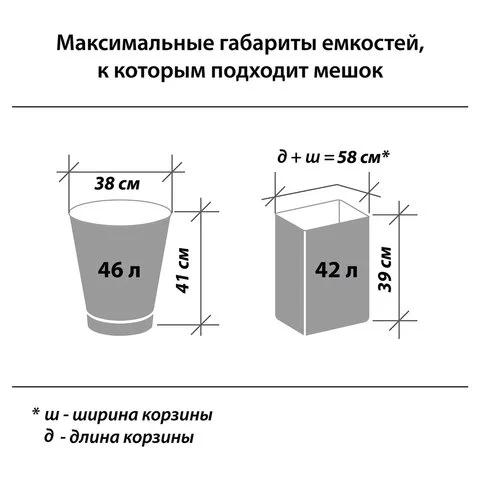 Изготовлены из полиэтилена низкого давления (ПНД) плотностью 15 микрон и имеют объем 60 литров. Размер мешка – 60х70 см (±5%). Поставляются в рулоне по 20 штук. Преимуществом данных мешков для мусора является высокая грузоподъемность.