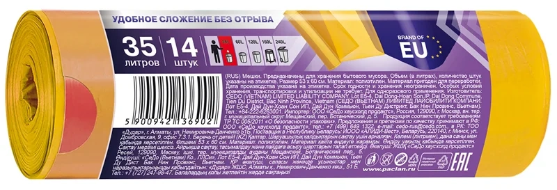 Мешки для мусора Paclan Multitop Aroma с завязками, 53 х 60 см, 35 л х 14 шт. в рулоне предназначены для сбора, перевозки и утилизации бытовых отходов. Изделия со свежим ароматом трав нейтрализуют неприятные запахи, что делает уборку более комфортной. Изделия выполнены из прочного, эластичного, устойчивого к проколам и разрывам полиэтилена. Благодаря удачной выкройке, дну в форме звезды и шву из нескольких спаянных слоев материала они хорошо помещаются в ведре, выдерживают значительный вес, способствуют равномерному распределению мусора. Ручки пакетов обеспечивают удобство в переноске отходов к контейнеру, а завязки надежно сохраняют содержимое.