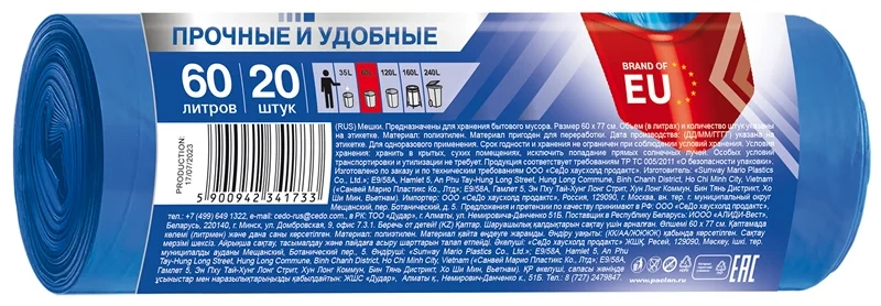 Мешки для мусора Paclan Multi-Top с тесьмой 60 х 77 см, 60 л х 20 шт. подходят для использования дома, в офисе. Это одноразовые изделия, которые предназначены для сбора мусора. Их изготавливают из прочного полиэтилена. Этот материал полностью безопасен для человека. При контакте с пищевыми продуктами не выделяет вредных и токсичных веществ. Мешки способны выдерживать значительный вес. Они не имеют срока годности. Для их сохранности следует соблюдать правила, указанные производителем. Недопустимо хранить полиэтиленовые пакеты вблизи нагревательных приборов. Не следует оставлять их под прямыми солнечными лучами (на балконах, подоконниках и в других местах) или в помещениях с температурой выше 400 градусов.