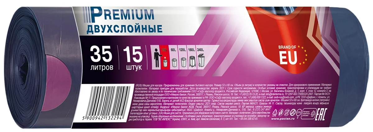 Пакеты для мусора Paclan Premium синий в рулоне, 53 х 60 см, 35 л х 15 шт. изготовлены из высокопрочного полиэтилена и предназначены для пищевых и бытовых отходов. Изделия превосходно удерживают неприятные запахи и предотвращают распространение микробов. Благодаря оптимальной толщине и высокому показателю прочности пакеты устойчивы к повреждениям и способны выдерживать большие нагрузки. Мешки со специальными завязками легко размещаются в ведре. Благодаря своей универсальности их можно использовать как для дома, так и для офиса.
