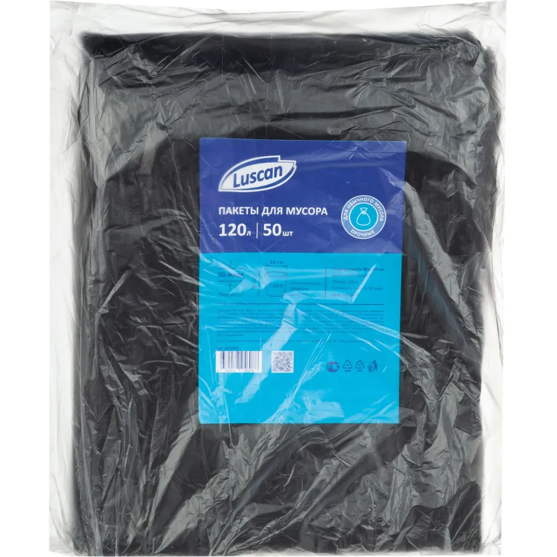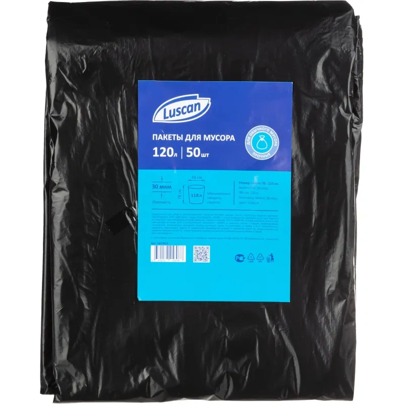 Мешки для мусора Luscan 120 л черные (ПВД, 30 мкм). Пакеты подходят для сбора листьев и растительного мусора при сезонной уборке улиц, бульваров, скверов, парков. Применяются для хранения и транспортировки строительного и производственного мусора, бытовых и продуктовых отходов. Изготовлены из полиэтилена высокого давления (ПВД). Не являются ароматизированными и биоразлагаемыми. Упакованы по 50 пакетов в пачке.