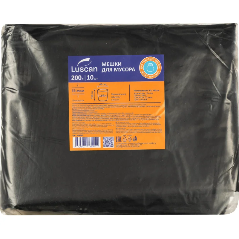 Мешки для мусора Luscan (Комус) 200 л чёрные (ПВД 55 мкм, 10 штук)