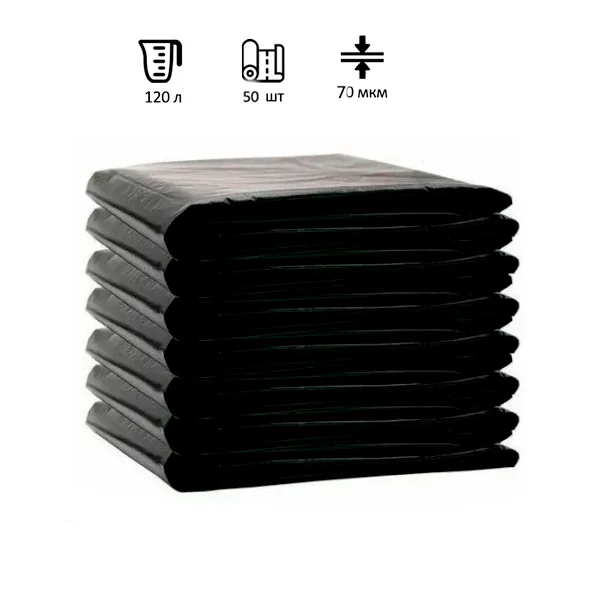 Мешки для мусора Ромашка 120л, ПВД, 70х110см, 70мкм, 50шт, 100г, черного цвета, в пласте