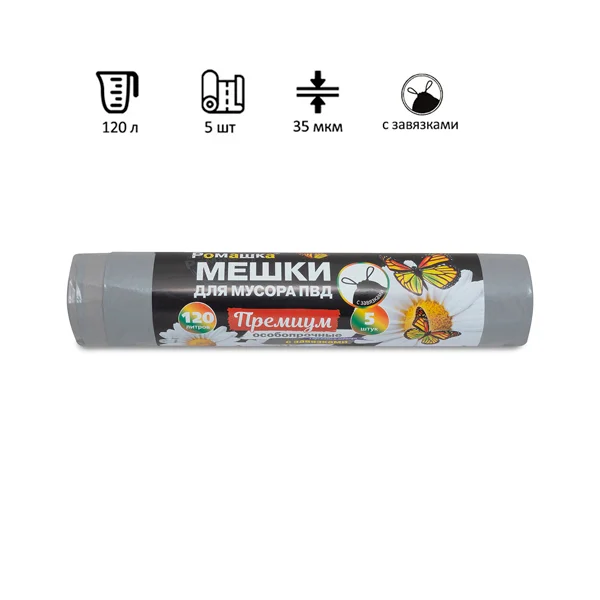 Мешки для мусора Ромашка 120л, с завязками, ПВД, 70х110см, 35мкм, 5шт, серые, в рулоне