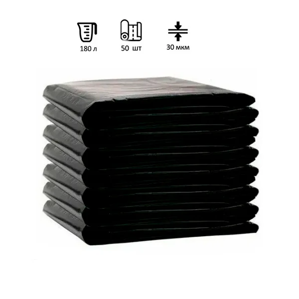 Мешки для мусора Ромашка 180л, ПВД, 90х110см, 30мкм, 55гр, 50шт, черного цвета, в пласте
