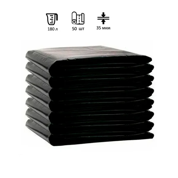 Мешки для мусора Ромашка 180л, ПВД, 90х110см, 35мкм, 50шт, черного цвета, в пласте