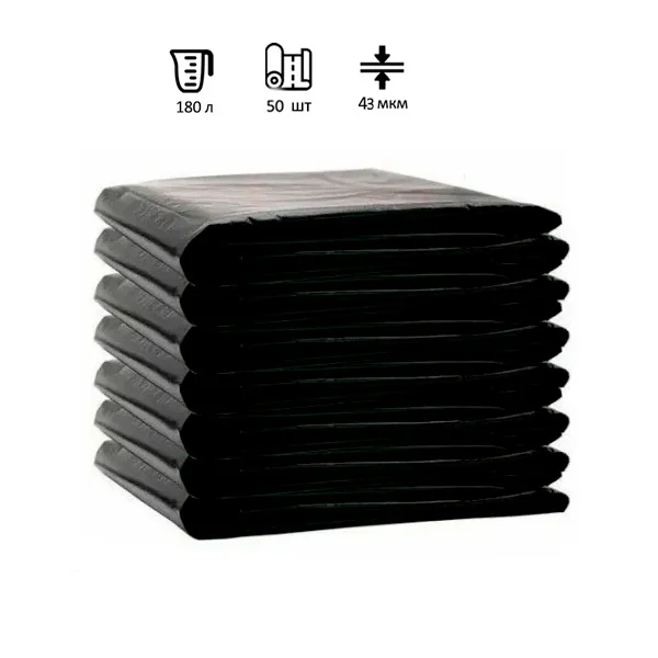Мешки для мусора Ромашка 180л, ПВД, 90х110см, 43мкм, 50шт, черного цвета, в пласте