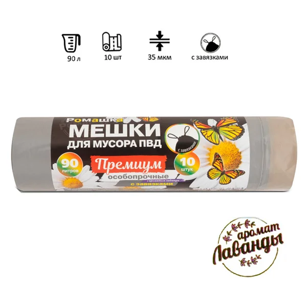 Мешки для мусора Ромашка 90л, с завязками, ПВД, 75х85см, 35мкм, 10шт, серые, в рулоне