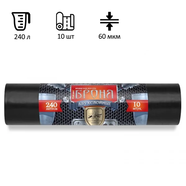 Мешки для мусора 2-х слойные серии 'БРОНЯ' отличаются сверх прочностью и герметичностью, что особенно важно для компаний, работающих сфере строительства и медицины. Изготовлены из полиэтилена высокого давления (ПВД) плотностью 60 микрон и имеют объем 240 литров. Размер мешка – 100х130 см (±5%). Поставляются в рулоне по 10 штук. Преимуществом данных мешков для мусора является очень высокая грузоподъемность. Цвет – черный.
