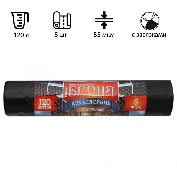 Мешки для мусора Ромашка Броня 120л, с завязками, ПВД, 70х110см, 55мкм, 5шт, черного цвета, в рулоне