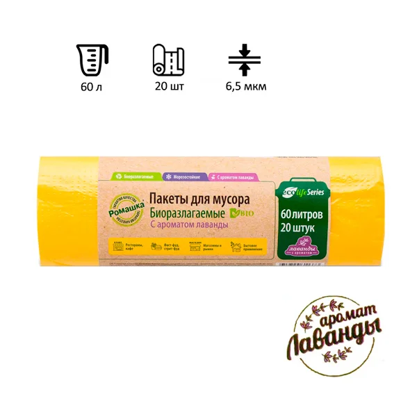 Мешки для мусора Ромашка Эколайф 60л, биоразлагаемые, ПНД, 56х68см, 6.5мкм, 20шт, желтые, в рулоне