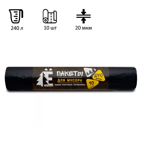 Мешки для мусора Ромашка Эконом 240л, ПВД, 86х125см, 20мкм, 10шт, черного цвета, в рулоне