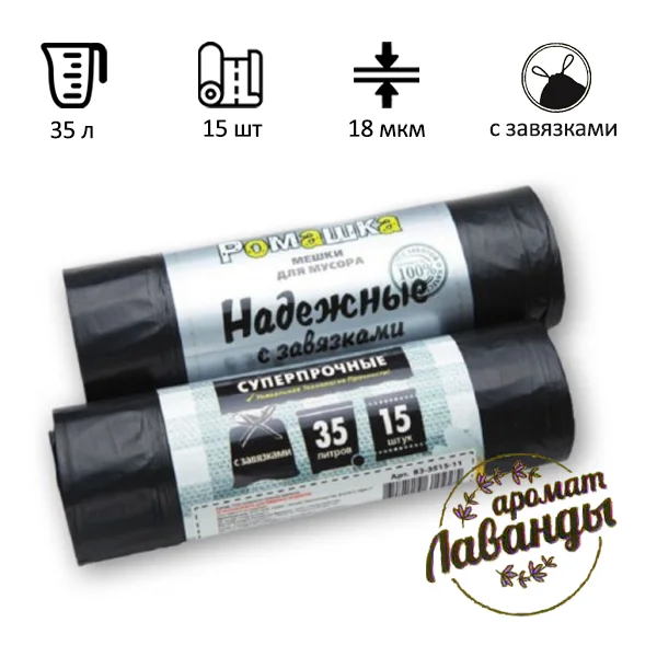 Мешки для мусора Ромашка Надежные с завязками 35л, ПСД, 50х53см, 18мкм, 15шт, черного цвета, в рулоне