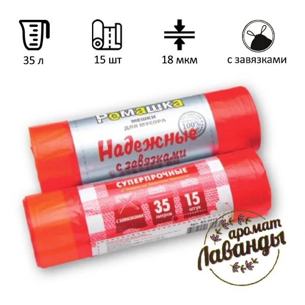 Мешки для мусора Ромашка Надежные с завязками 35л, ПСД, 50х53см, 18мкм, 15шт, красные, в рулоне