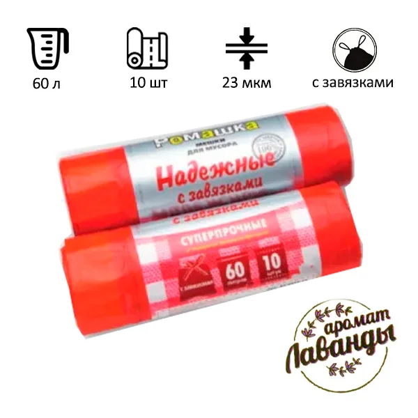 Мешки для мусора Ромашка Надежные с завязками 60л, ПСД, 59х64см, 23мкм, 10шт, красные, в рулоне