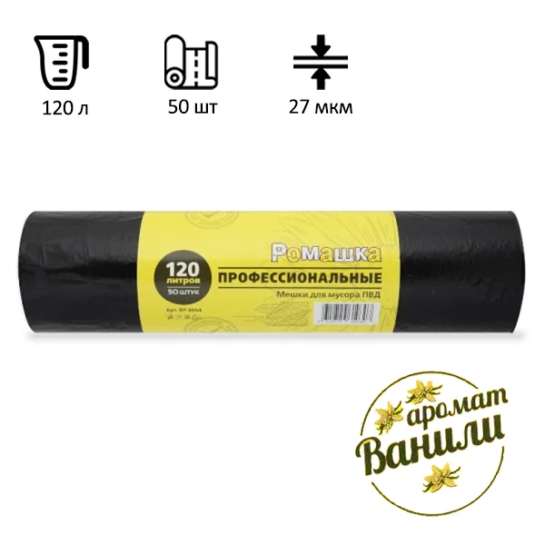 Мешки для мусора Ромашка Профи 120л, ПВД, 68х105см, 27мкм, 50шт, черного цвета, в рулоне