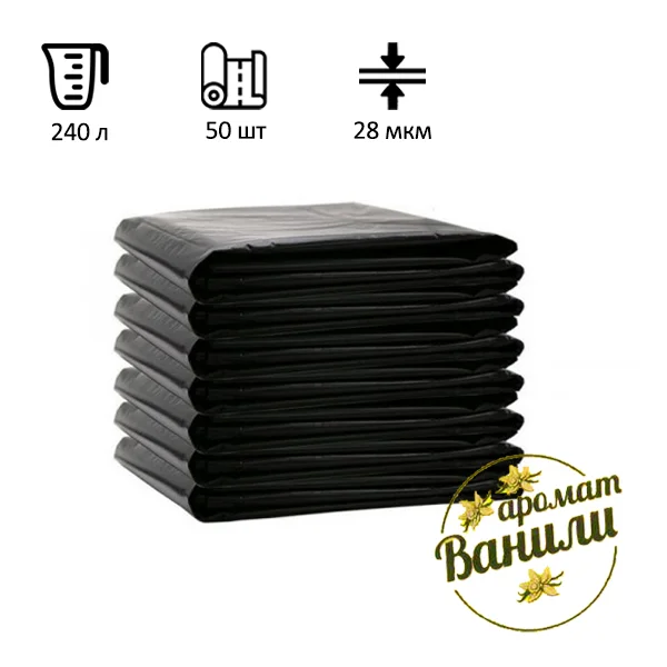 Мешки для мусора Ромашка Стандарт 240л, ПВД, 105х135см, 28мкм, 50шт, 75гр, черного цвета, в пласте