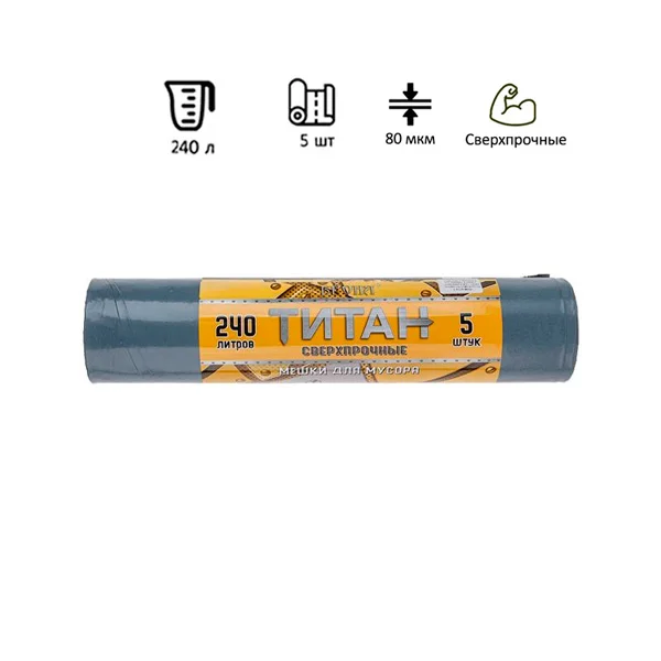 Мешки для мусора Ромашка Титан 240л, ПВД, 100х130см, 80мкм, 5шт, серо-черного цвета, в рулоне