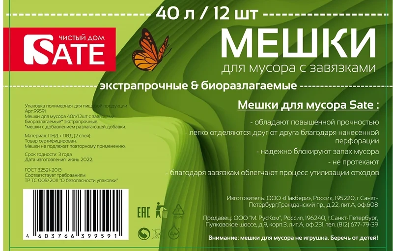 Мешки высшего качества на Российском рынке. Выполнены из двух видов полиэтилена (ПНД+ПВД) - прочные и на прокол и на разрыв. Биоразлагаемые. С завязками. Приятного белого цвета.Удобство и комфорт использования. Безопасны для окружающей среды. Биоразлагаемые мешки для мусора созданы из материалов, которые после использования разлагаются за 2-3 года под действием кислорода, воды и света и превращаются в органические соединения.