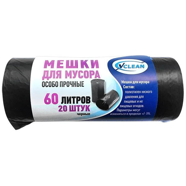Мешки для мусора: VCLEAN Professional особо прочные 60 литров, размер 60х70 см черные, рулон 20 шт.Материал: полиэтилен низкого давления.