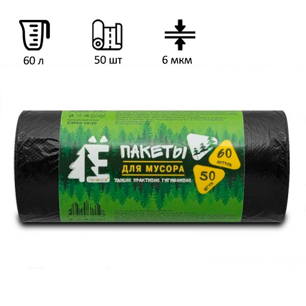 Мешки для мусора Ё-Ромашка Эконом 60л, ПНД, 58х68см, 6мкм, 50шт, 4.5г, черного цвета, в рулоне