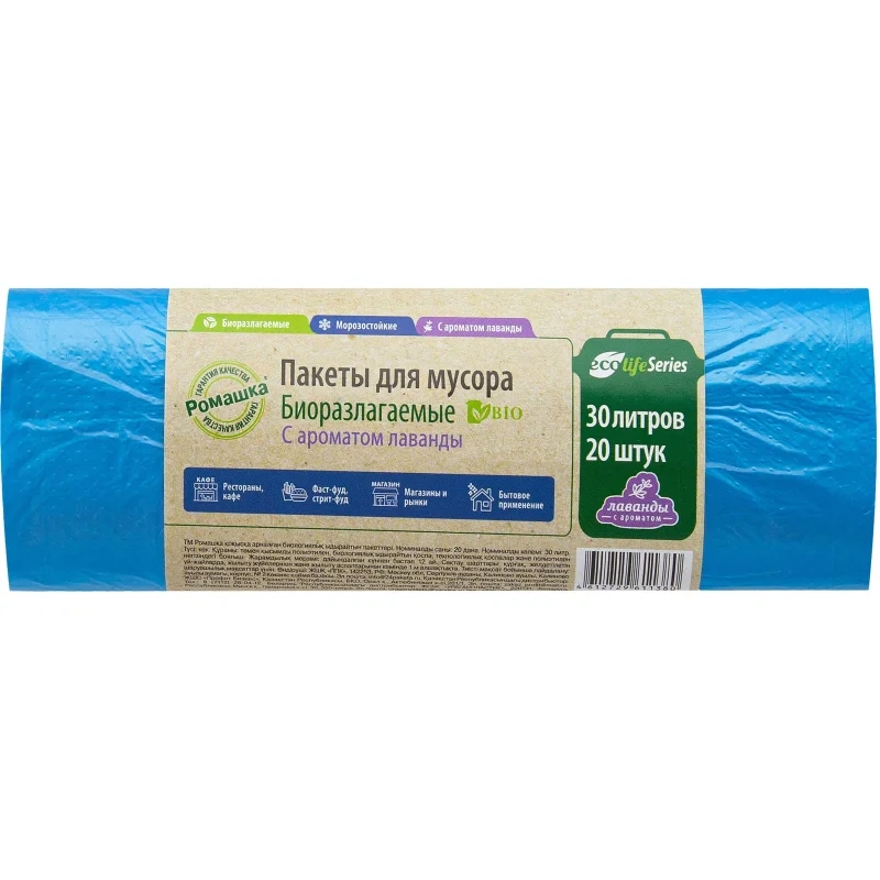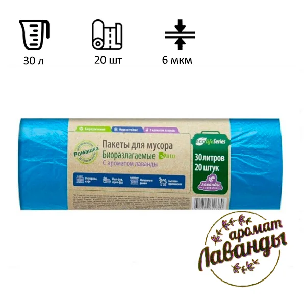 Мешки для мусора Ромашка Эколайф 30л, биоразлагаемые, ПНД, 50х57.5см, 6мкм, 20шт, синие, в рулоне