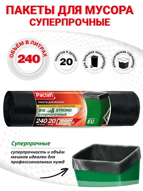 Мешки для мусора 240л Paclan 'Big&strong' ПВД, 140*90см, 20шт., черного цвета, в рулоне